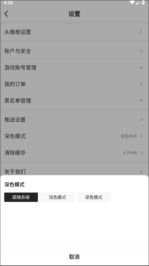 3、然后,在弹出的选择框中选择深色模式即可进入夜间模式即可完成设置。
