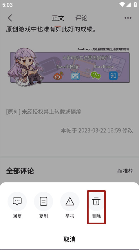 3、然后,长按自己评论会弹出一个选项框,在选项框中找到并点击“删除”按钮选项即可完成删除评论了。