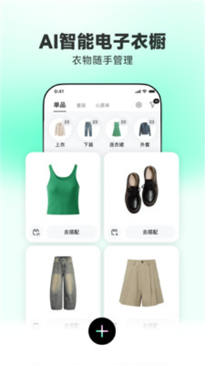 2、快速搭建电子衣橱:拍照上传即可完成衣物数字化管理,衣橱一目了然。
