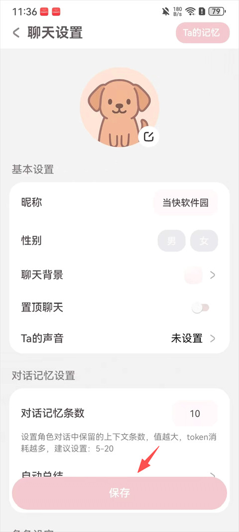 4、在聊天设置页还可以修改新人物的昵称性别声音以及对话设置等。