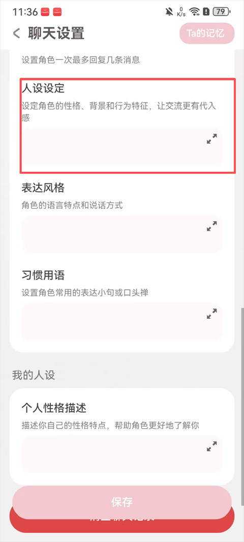 3、为人物创建/修改其出生背景、性格、长相等设定,完成后点击保存;