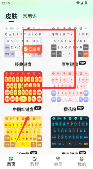 提供多种皮肤样式,包括有经典键盘、原生键盘、中国红键盘、樱花粉键盘、活力典和发光键盘。