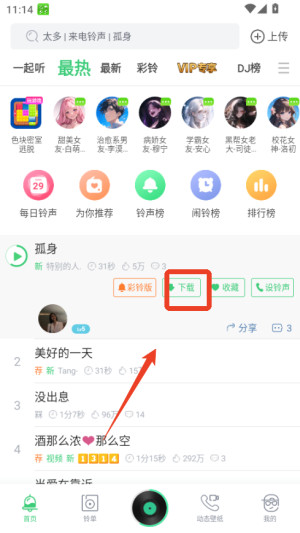 2、看到喜欢的铃声直接点下载,保存到本地后进入设置页面,一键就能设为来电或短信提示音,操作很简单。