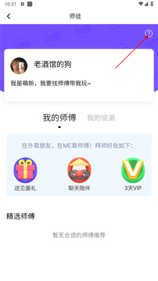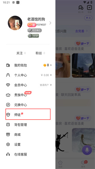 1、打开ME语音软件,点击左上角头像找到“师徒”选项。
