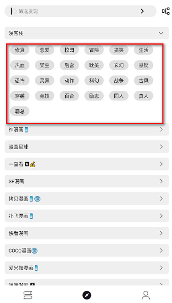 1、下载并安装好最新版的泼辣漫画,打开后点击底部中间的栏目板块。