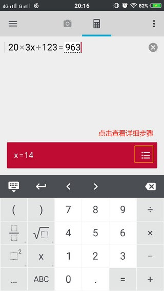 3、只需将相机指向一个数学表达式,PhotoMath 会立即显示答案。
