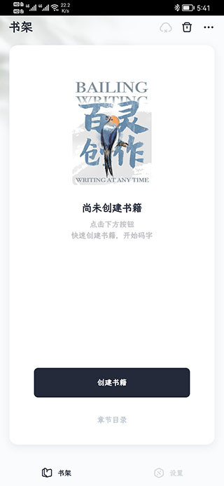 1、下载安装后,打开百灵创作助手软件,我们看到界面非常简洁,没有广告,是个实打实的创作软件,现在还没有创建书籍,我们点击创建书籍,进行下一步。