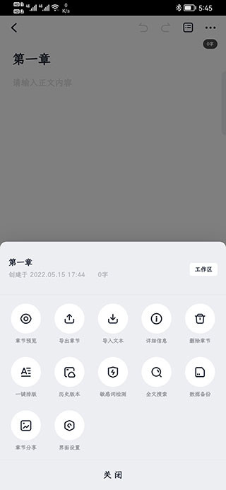 8、软件编辑界面功能也不少,在目录旁边的三个点,点击就可以打开,我们看看有哪些功能,章节预览、导出章节、导入文本、详细的信息、删除章节、一键排版等功能,功能都是创作必用的。
