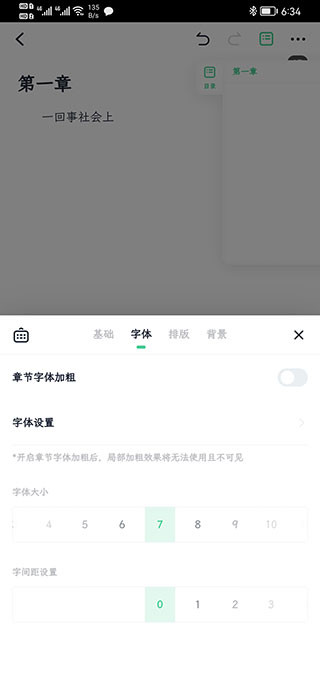 2、在设置里有基础、字体、排版、背景,我们点击字体,在字体界面里点击字体设置,进入字体设置界面。
