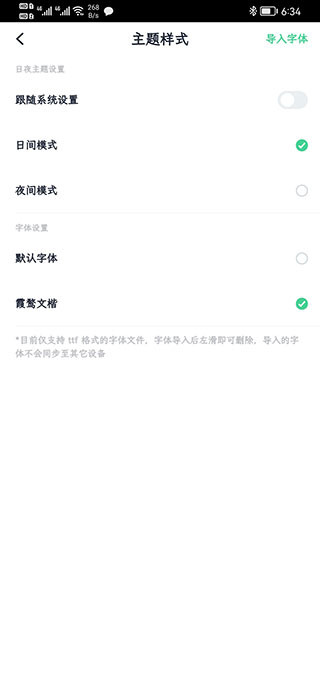 3、在界面里右上角一个导入字体,点击进入管理器界面,在管理器里选择字体就可以添加了,目前字体只支持ttf格式哦,添加完成在字体设置里可以看到。