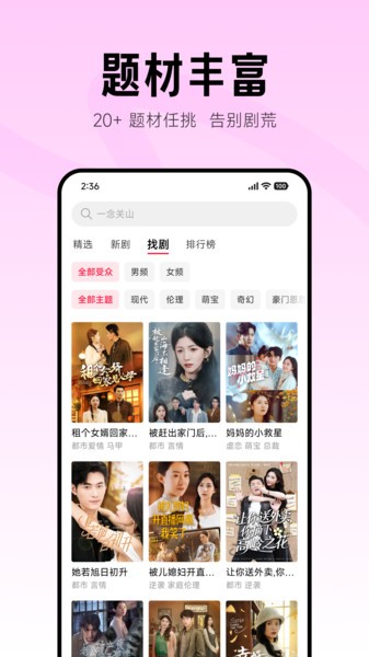 围观短剧纯净版收录都市、言情、悬疑、复仇、总裁和家庭伦理等多类短剧,用户可以按题材挑选,也可以通过榜单查看当前热度较高的内容。