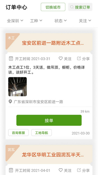 登录APP后面,选择“订单”师傅们可以在这里看到订单信息,例如招什么工种、工程量上多少,还有具体是干什么的,最主要的是还有薪资是多少,不过师傅要是想去接单其他地方的单,可以点击右上角的“切换城市”