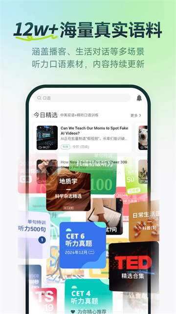 四六级,专四,专八,考研,托业,托福,雅思,高考英语,BEC,VOA,TED,商务英语... 应有尽有。