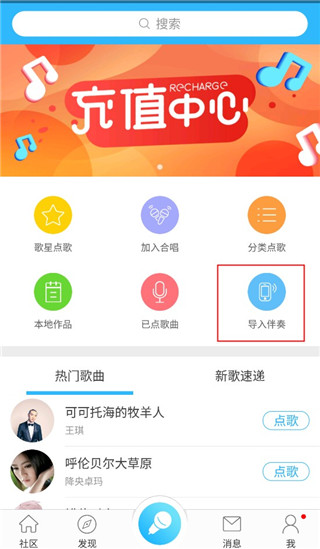 1、打开软件,在“K歌”页面点击“导入伴奏”按钮;