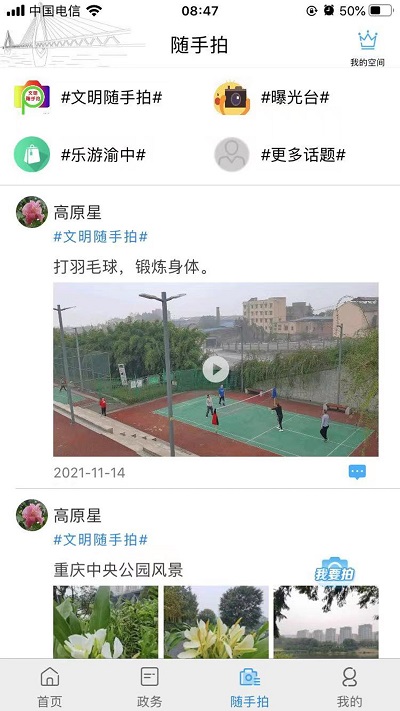 1、打开重庆渝中app,点击下方【随手拍】;