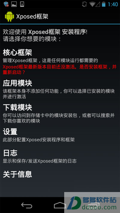 1、首先:Xposed 框架需要Android 4.0.3及更高版本才能安装,目前还不支持Android 4.4,以后的版本应该会支持。Xposed 框架也需要有ROOT授权才能安装,安卓的一切高级应用都需要ROOT权限,所以如果你想痛快的玩机,去ROOT吧!