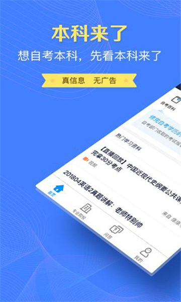 本科来了是一款比较好用的软件,它是一款专门为大学生所打造的一款教育软件,提供了非常丰富的校园资讯,所有的用户都可以及时的去了解,同时它的功能也是比较的强大,有效的帮助我们大家进行查看,还提供免费公共课资源、智能成绩查询系统以及活跃的问答社区,让自考之路不再孤单。