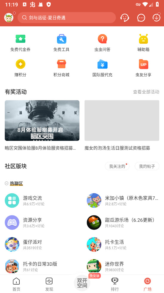 5、点开广场,有平台推荐的热门活动,还有游戏社区,玩家可以社区相互交流;