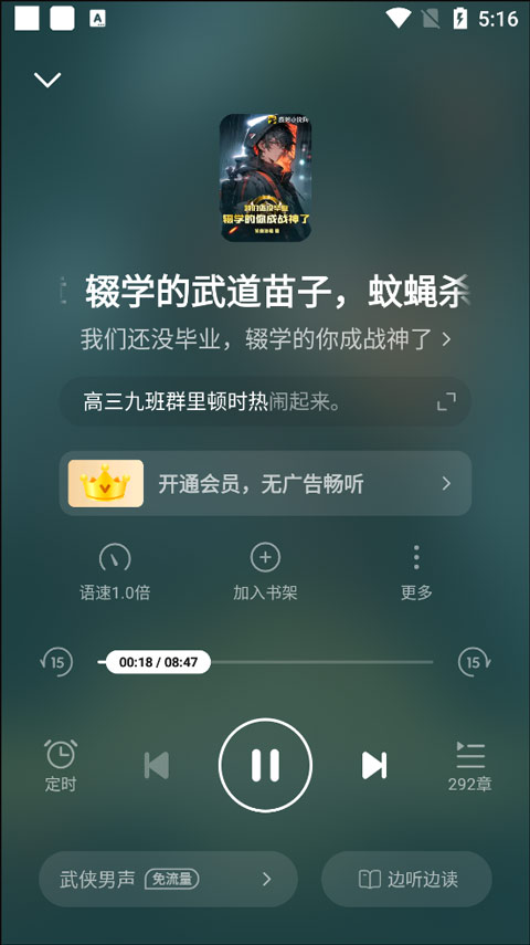 3、进入听书界面,这里可以任选一个章节听,还有给听书时间定时、调语速以及加入书架的功能