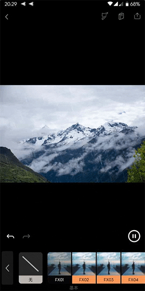 在刚刚完成的照片中,已经有了「云雾缭绕」的效果,接下来我们让画面多一分「山中细雨,润物无声」的意境。我们可以在「覆层」中选择「细雨」的特效,并调节效果的强弱度,避免特效太过明显而喧宾夺主。