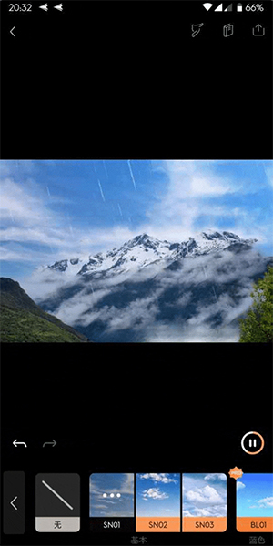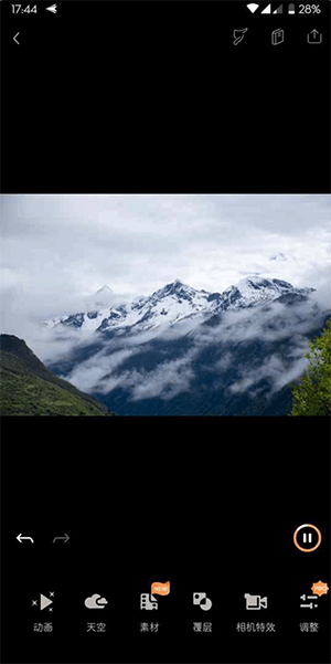 增加了「覆层」和「相机特效」后,如果你对图片里这一片白茫茫的天空不满意,更偏向「空山新雨后」的那种万里晴空,我们就需要使用 Pixaloop 的「换天」功能,一键让天空变晴朗。