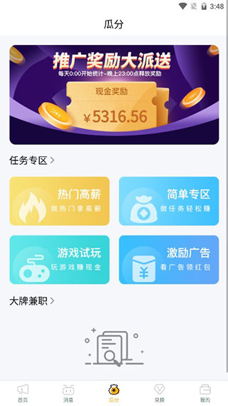 软件当中拥有着非常多的任务模式,没有任何复杂的操作,能够及时的去进行选择,根据自身的情况来选择合适自己的专区,并且推广的话还会有奖励大派送哦。