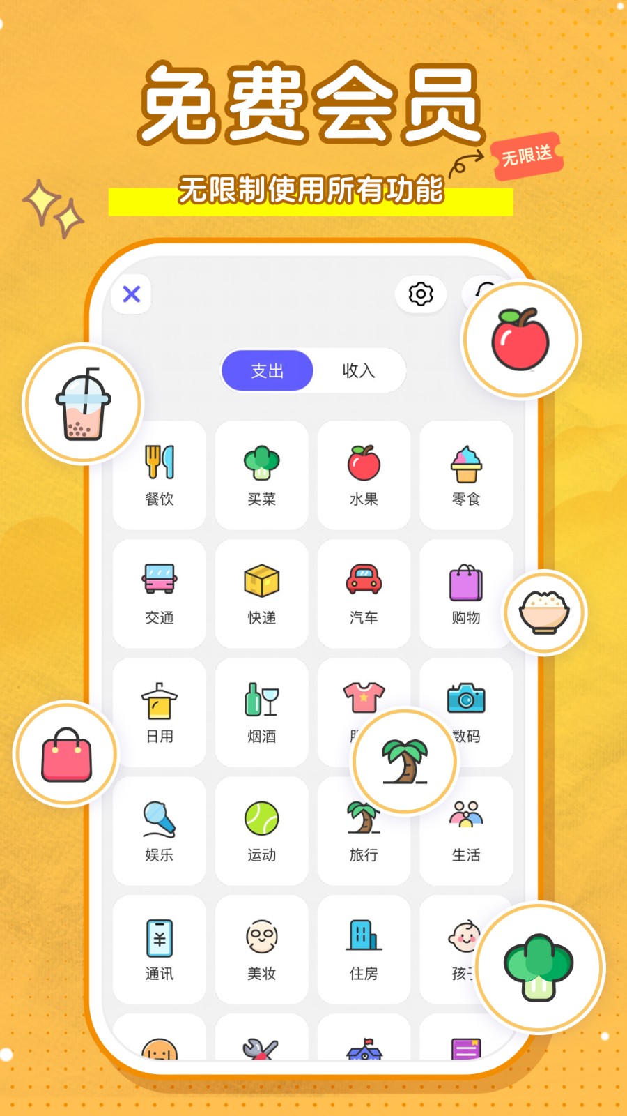 2. 轻松记账:点击主页上的记账按钮,选择类别,输入金额,单笔记账就完成了!