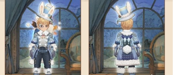 4、男装:主要配色是蓝、白、灰青,头上同样带有兔兔礼帽,整体都搭配了兔毛边边,显得十分暖和。