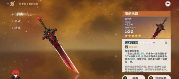 4、狼的末路提供高额物理攻击力加成,同时还有跟全队提供攻击力加成的效果,适合迪卢克、优菈和雷泽等多个物理输出角色使用。