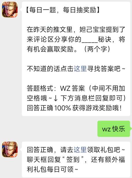 在昨天的推文里妲己宝宝提到了来评论区分享你的__秘诀将有机会赢取奖励答题格式:WZ答案,11月22日王者荣耀每日答题的答案是什么?可能还有不知道答案的小伙伴,一起来看看正确的答案领取每日奖励吧。