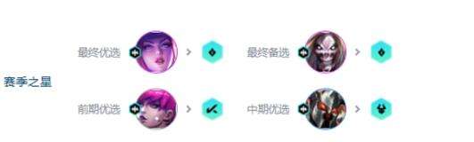 3、前期可以先拿伊芙琳的赛季之星打工,中期如果看到铁男可以拿下来,最终还是要找阿卡丽的赛季之星。