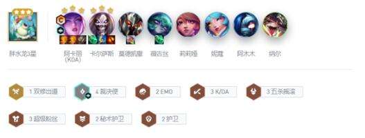 2、组成羁绊:4裁决使、2EMO、3KDA、3五杀摇滚、3超级粉丝、2秘书护卫、2护卫、1双修出道。