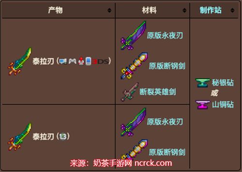 通过日食事件获得英雄断剑,合成原版断钢剑以及原版永夜刃。携带原版断钢剑和原版永夜刃,靠近秘银砧,两把武器可以合成泰拉之刃。泰拉之刃是均衡能力很强的武器,伤害和攻速出色,并且可以发射剑气进行远程输出。