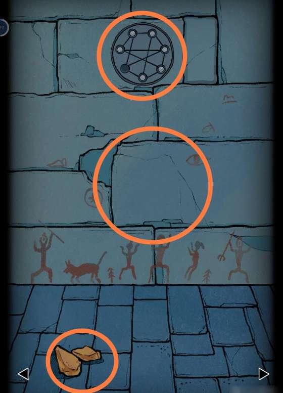 1.左下角获得打火石,中间墙壁点击三下获得石板,上面完成一个小游戏,获得法杖。