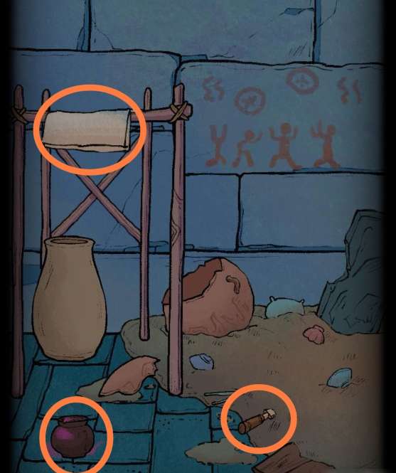 11.进入右边的石室,架子上获得拓印纸,地上获得颜料粉,沙子里获得凿子。
