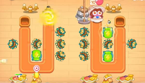 2、接着在右侧障碍物被清除一部分后,按图在地图中间道路放置三个多重箭攻击敌人,旁边再放置一个绿瓶子来清除下方障碍物。