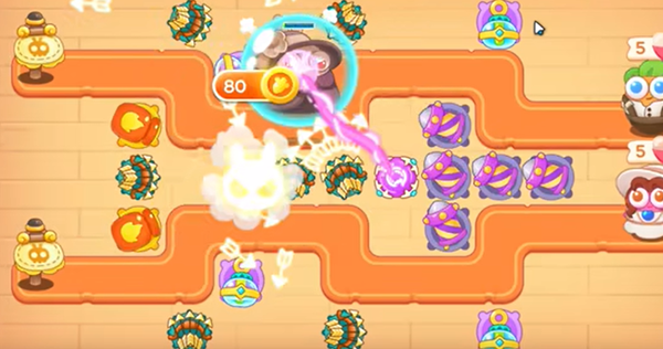 2、接着在右侧障碍物被清除一部分后,按图在地图右侧中间道路放置两个礼炮塔和一个魔法球来增加火力,攻击敌人。