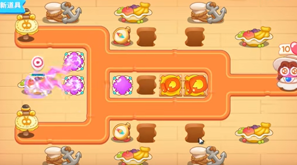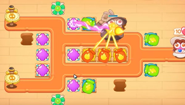 1、首先玩家进入地图后,地图中间会送个一个魔法球,在地图右侧道路拐弯处先放置一个木板再放满级红瓶子炮塔来清除前期的敌人和障碍物。