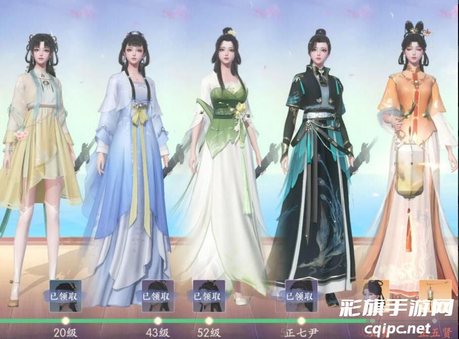 一共五套时装分别是桃杏微雨、幽兰馥、碧云引风、书院行歌、花灯如昼,样式可是看图,每一套都可以进行染色,下面是解锁条件: