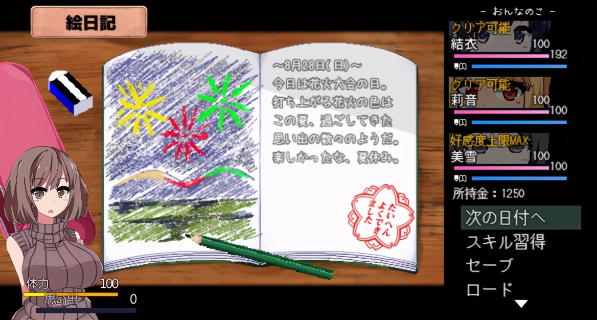4.当与女主角在一起或者触发事件时,便会获得并累计回忆点数。回忆点数将在每日结束后,画绘图日记的画面中(绘图日记的画面会因为本日发生的事件而改变内容)被转换为技能点数,可以使用技能点数学习各种技能,每个技能的习得条件不同,但基本上随着与女主角之间的事件推进就会开放学习。为了玩法的多样化,习得技能是很有必要的。