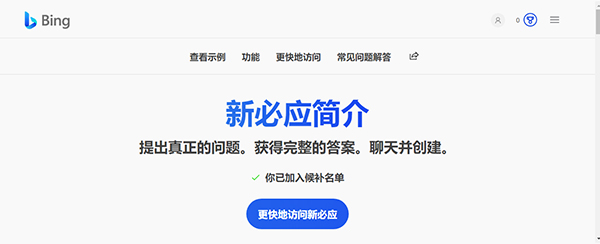 4、加入候补名单成功后界面如下图所示,接着等申请通过之后就可以使用new bing了