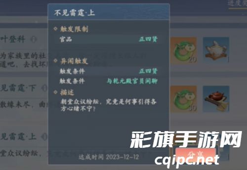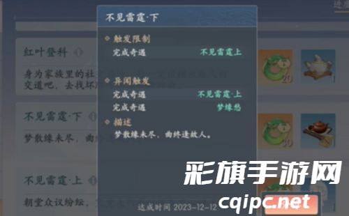 7、不见雷霆下:完成奇遇不见雷霆上和梦缘愁后即可完成。