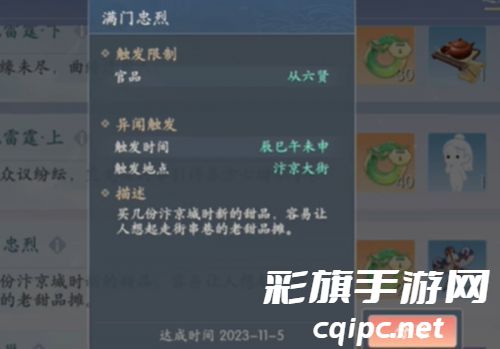 3、满门忠烈:从六贤后,等到辰巳午未申的时候,在汴京大街莲子娘处即可触发。