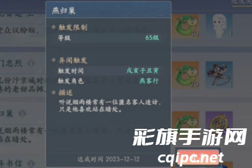 4、燕归巢:等级到达65级后,戌亥子丑寅时在烟雨楼的暗处找燕客行对话。