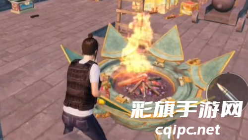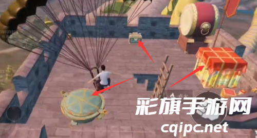 2、然后找到箱子、空投点击拾取,拿到加特林对着如下图箭头所示的物品点火;