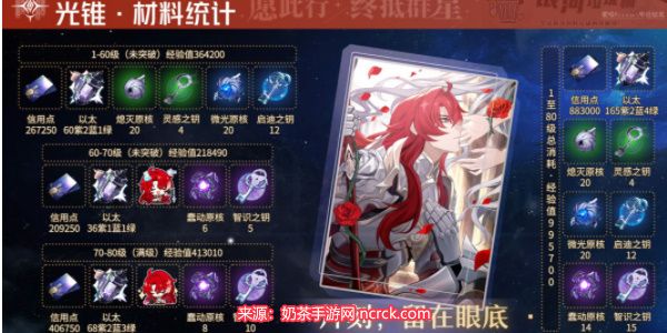 突破的行迹突破材料是信用点*3000000,熄灭原核*41,微光原核*56,蠢动原核*58,灵感之钥*18,启迪之钥*69,智识之钥之矢*139,命运的足迹*8,无穷假身的遗恨*12。
