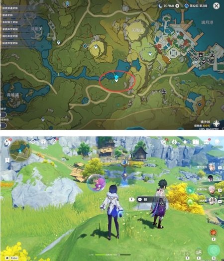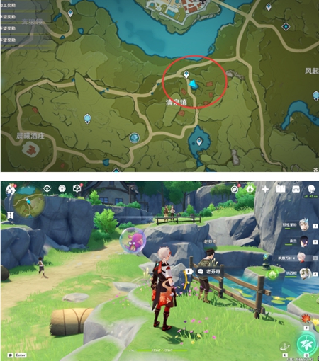 1、玩家打开地图来到蒙德清泉镇的传送点处,来到对面湖边能够看到有一个互动键,这就是第三个彩蛋。