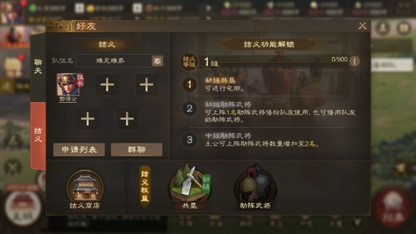结义后,主公们可以通过活跃行为 (击杀蛮族首领、获得同盟贡献) 提升结义等级,不同等级即可开启不同的结义功能及效果,目前已有助力发育的“共垦”功能,以及共享武将资源的“助阵武将”功能。