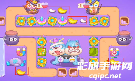 1、开局我们在两个出口这里放置磁铁,然后迅速打掉上面的道具,继续放置卡牌,有怪打怪没怪先把宝箱打出来。