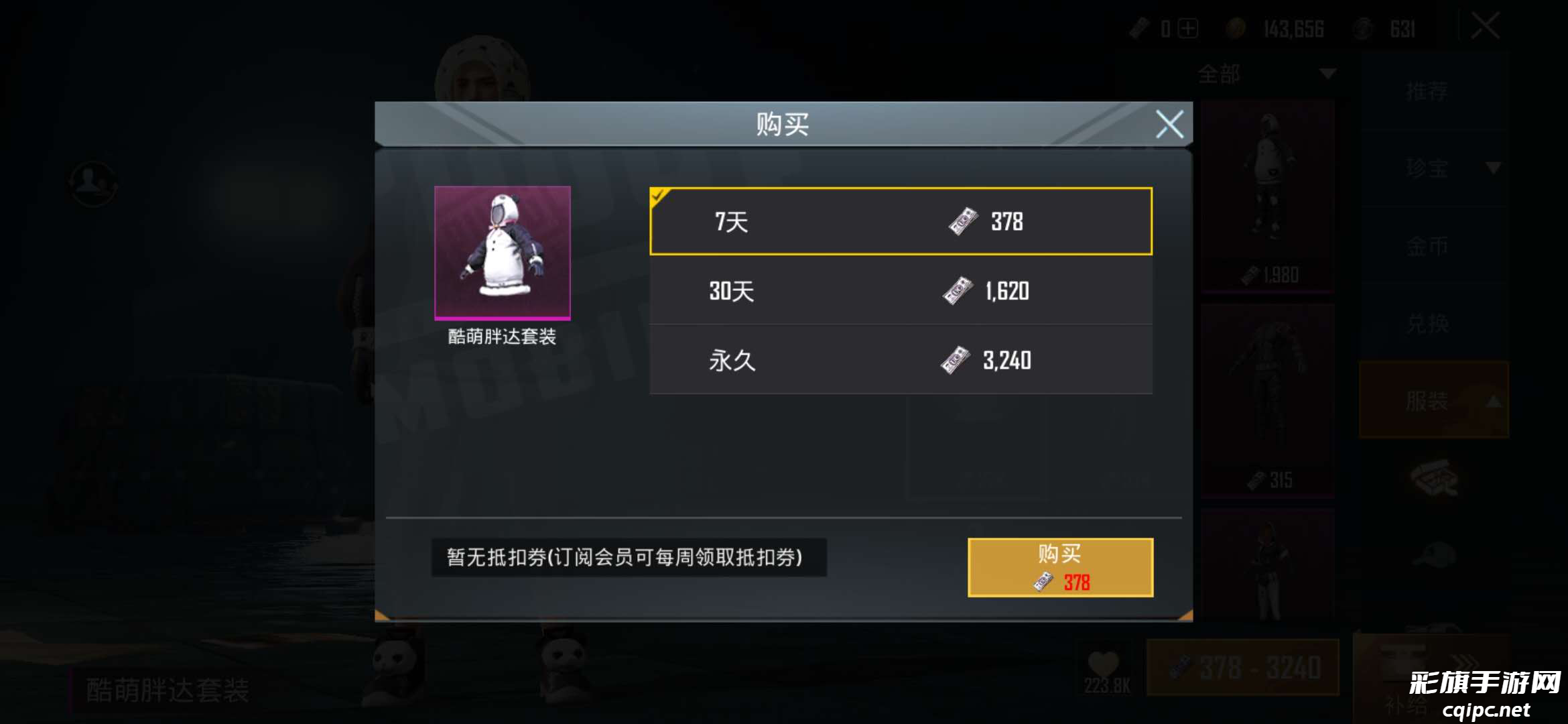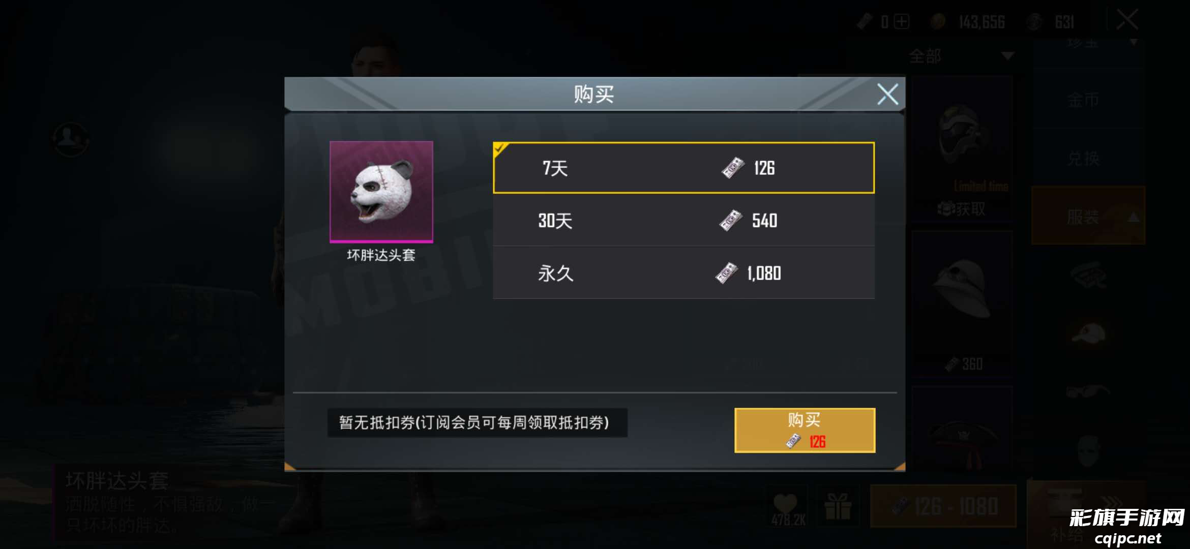 坏胖达头套目前可以通过商城直接购买到,售价是7天体验装126点UC币,30天则是540点UC币,永久获得则需要1080点UC币,小编推荐大家可以先购买一个7天体验装。125点uc币可以通过使用订阅会员抵扣卷来获得,不需要真的花费金钱,如果觉得确实可以的话,在花费UC币直接购买永久使用权。